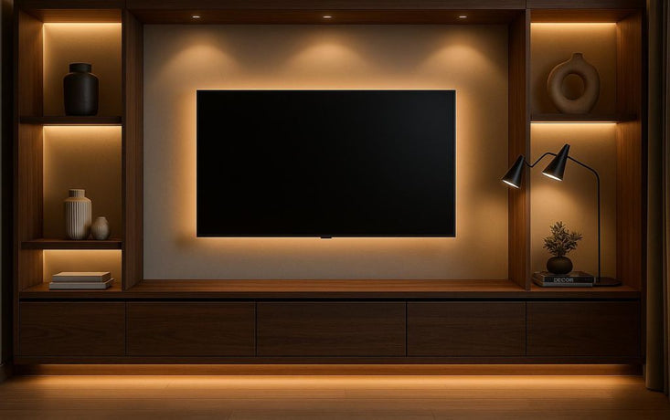 Clean lines, handle-free cupboards, and neutral colours suit contemporary spaces. Wall-mounted entertainment tv units are particularly effective here.