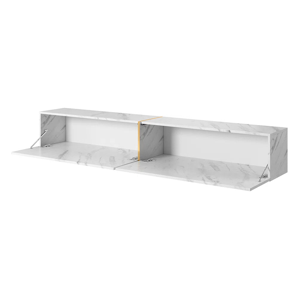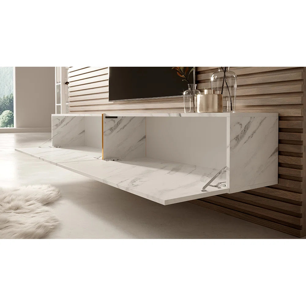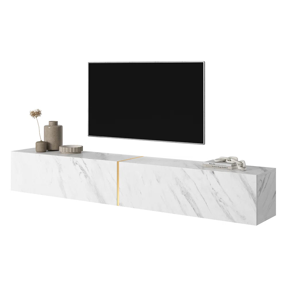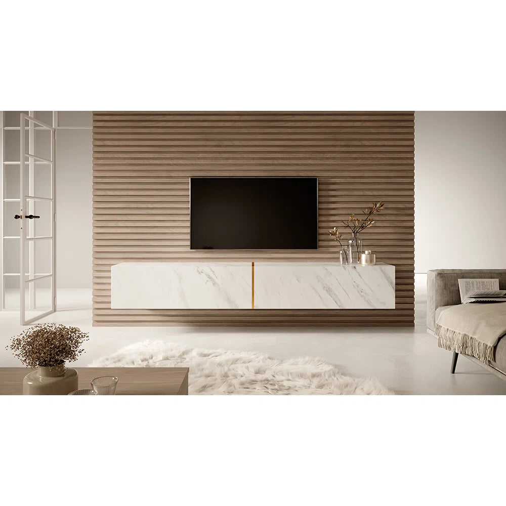 Bring bold elegance and everyday practicality into your living space with the Bramblyn TV Stand. Designed with a sleek white finish enhanced by a vertical gold marble-effect insert, this statement piece transforms any living room with minimal effort. Its clean, floating form complements both modern and classic interiors, while the subtle golden accent adds a luxurious touch that draws the eye without overwhelming the room.