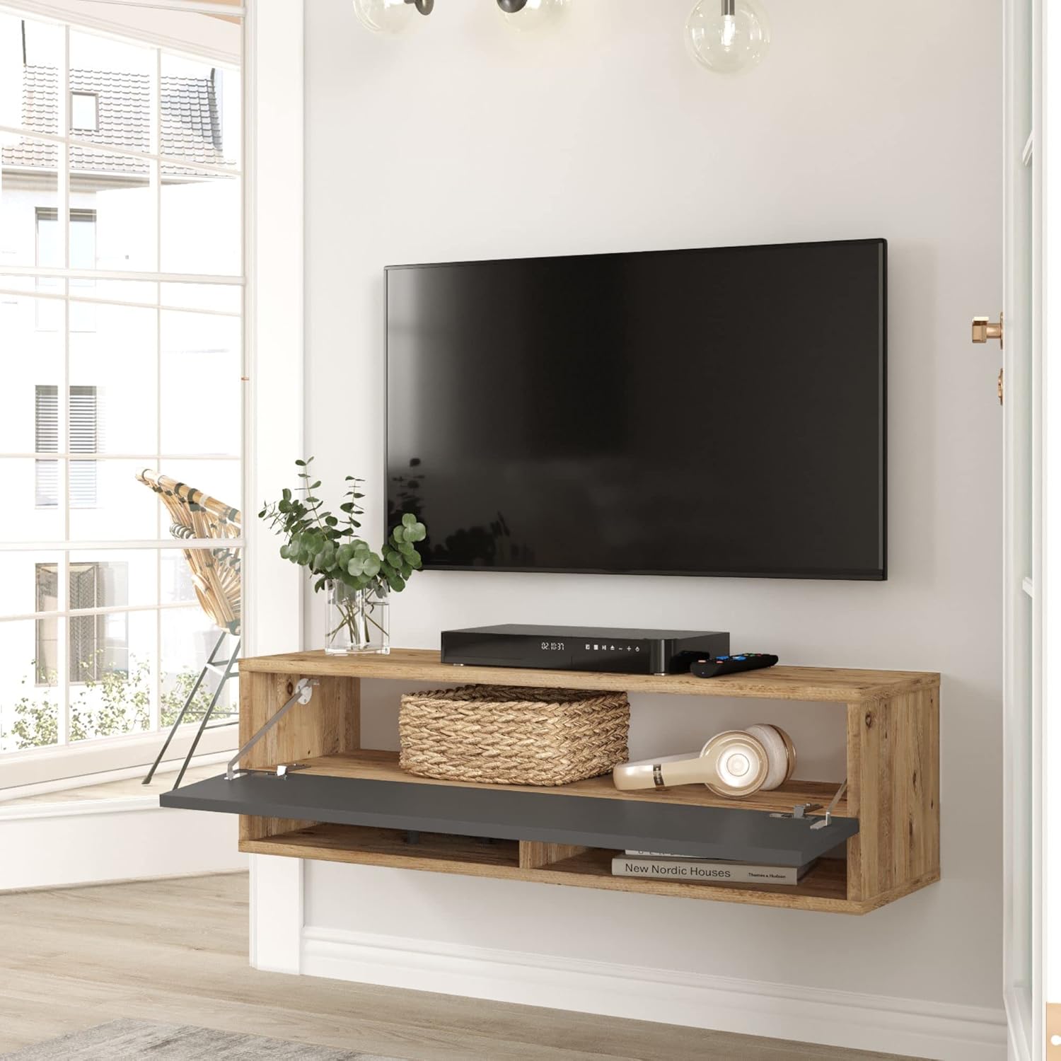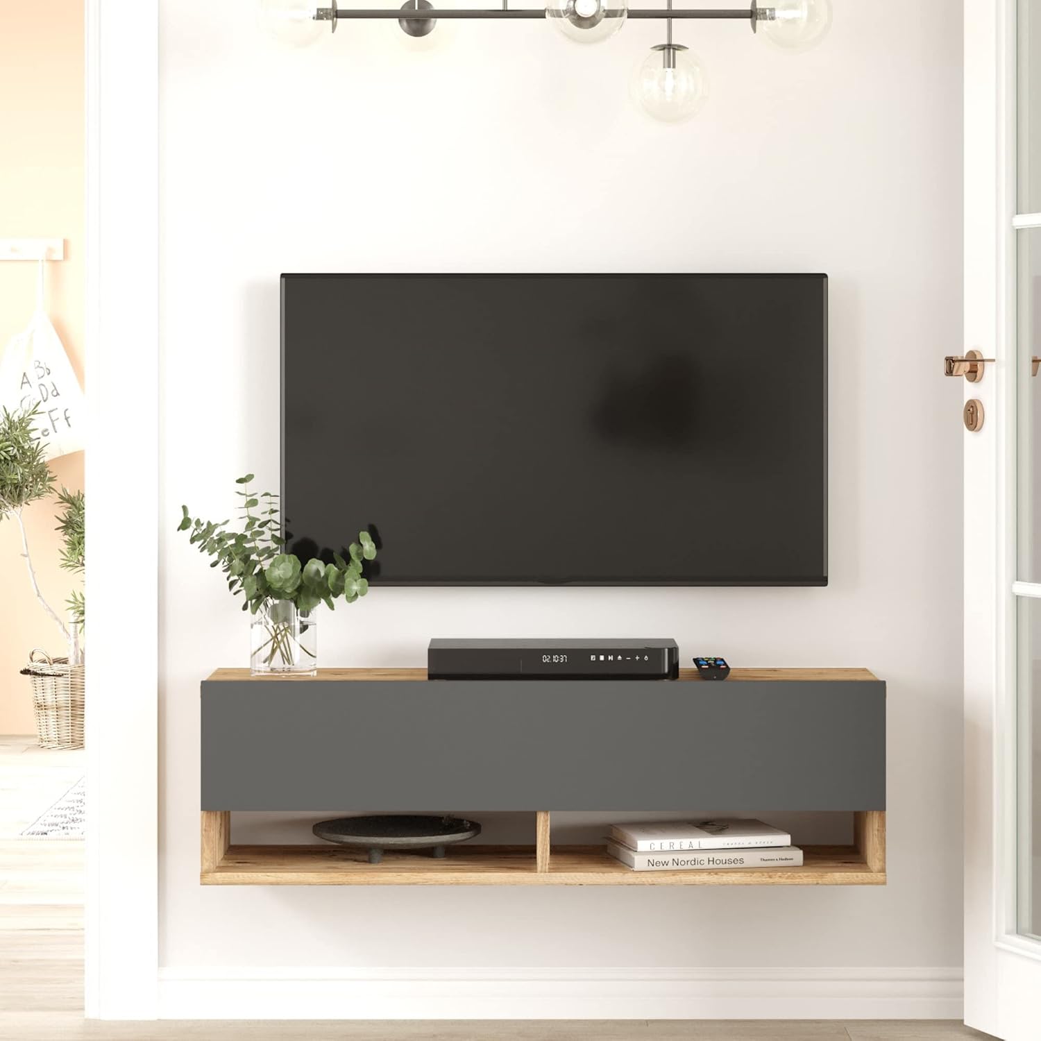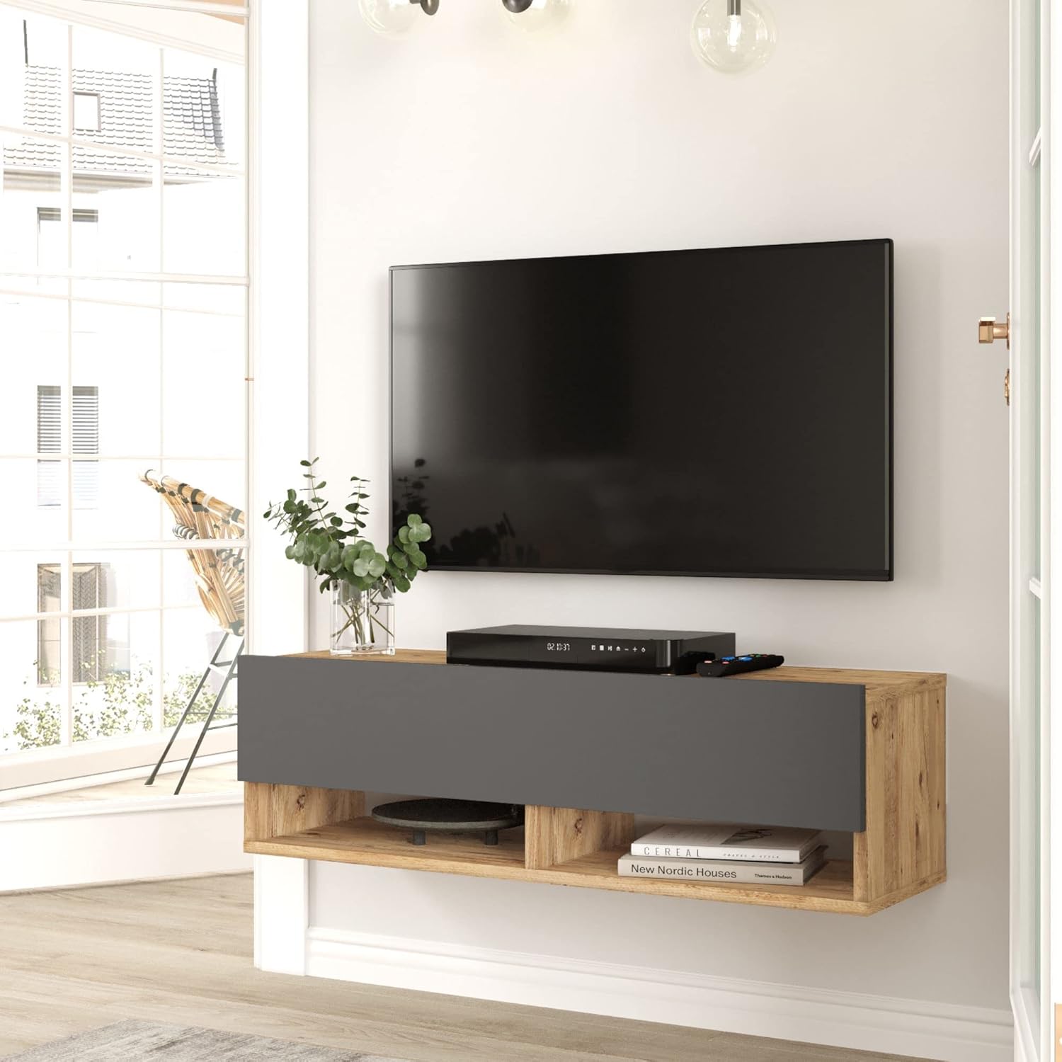 The Carmelle 100 cm Floating TV Unit in Rustic Oak/Anthracite is a stylish and practical addition to any modern living space. Designed to fit TVs up to 50 inches, it combines functionality with timeless rustic charm. The rich oak finish brings warmth and texture to your home décor, while the floating design creates a clean, contemporary look that saves floor space and enhances your room’s overall aesthetic.