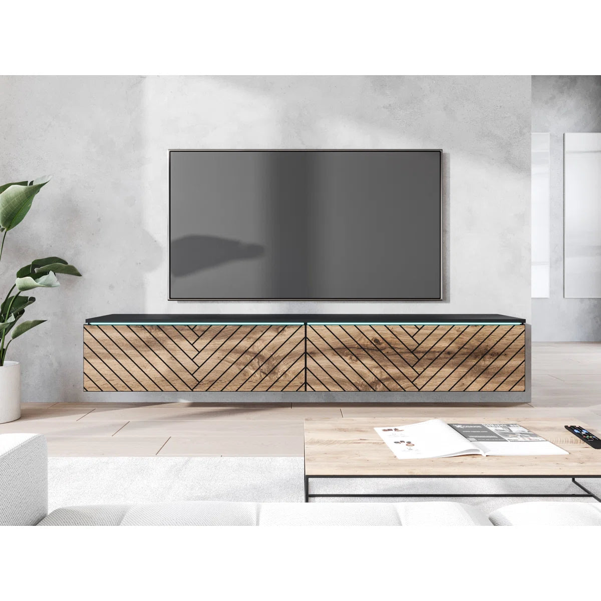 Striking yet minimalist, this wall-mounted TV stand brings contemporary elegance to any modern living space. With its sleek, streamlined silhouette and chevron-patterned front, it serves as both a functional centerpiece and a design statement. The glossy cabinet finish adds a touch of sophistication, while the floating design creates an airy, uncluttered look perfect for minimalist interiors.