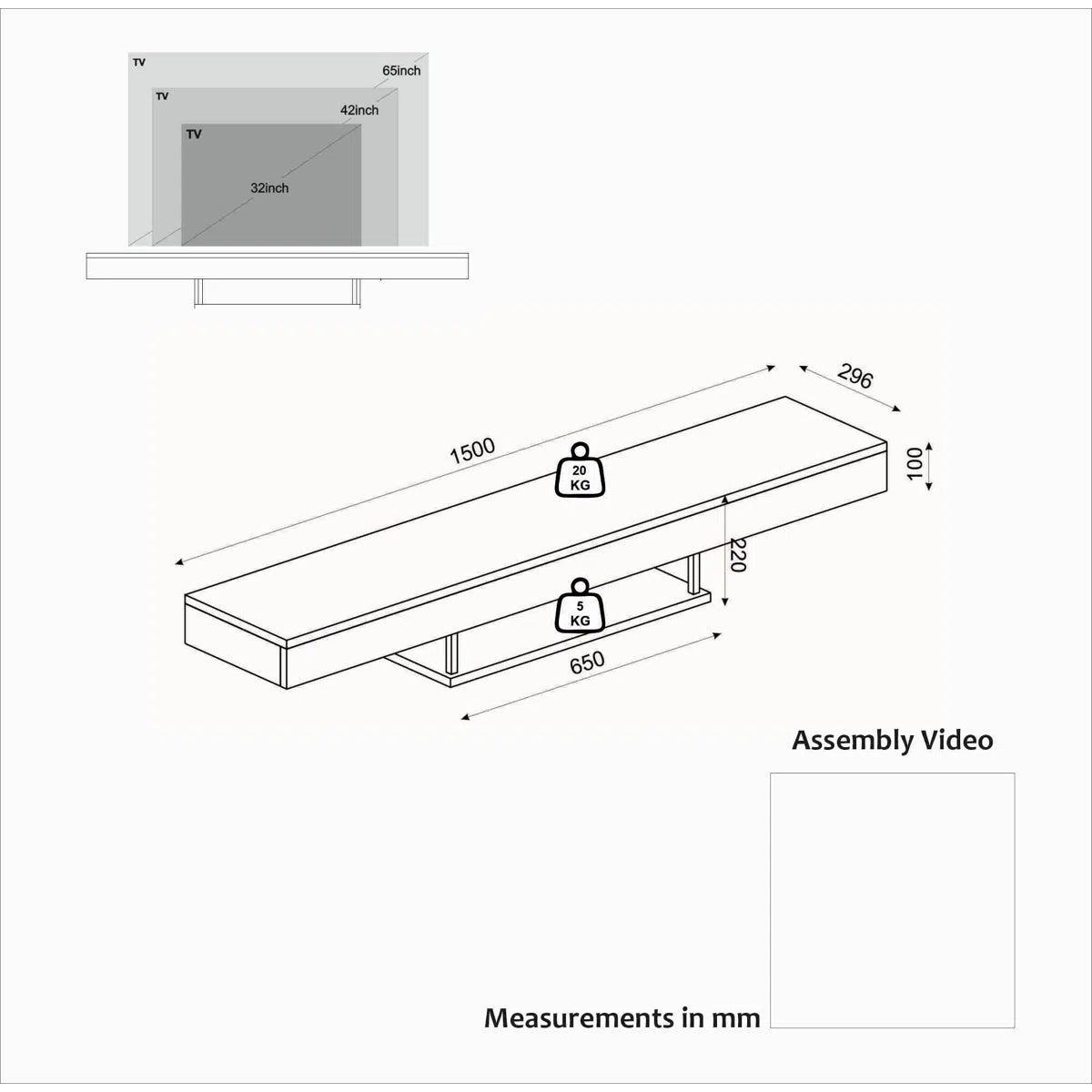 With a width of 150 cm, the Jeremiah TV Stand comfortably accommodates TVs up to 60" and provides practical storage for media devices, books, or décor with its open shelf design. Crafted from durable particle board, this stand is built for everyday use and supports up to 50 kg in weight. Whether you're hosting a movie night or simply relaxing with your favorite show, the stand keeps everything you need within easy reach—without compromising on style.