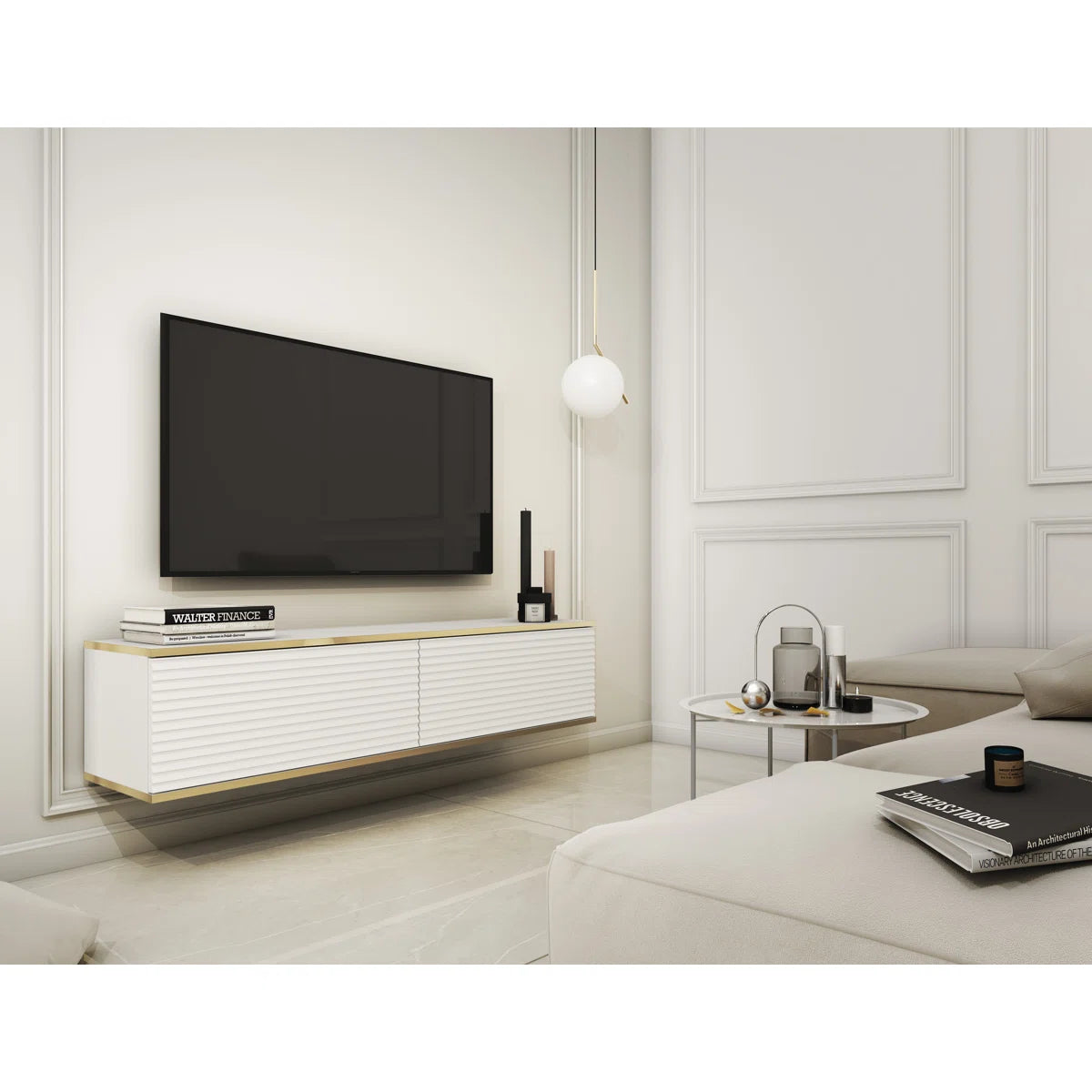 Bring a bold statement to your entertainment area with the River Floating TV Unit, a wall-mounted piece that blends luxury with contemporary design. Designed for TVs up to 60 inches, this unit features golden trim accents and corrugated door fronts that add texture and elegance, making it a striking centerpiece in any modern interior. Its floating mount design offers a light, spacious feel while creating an uncluttered, minimalist aesthetic.