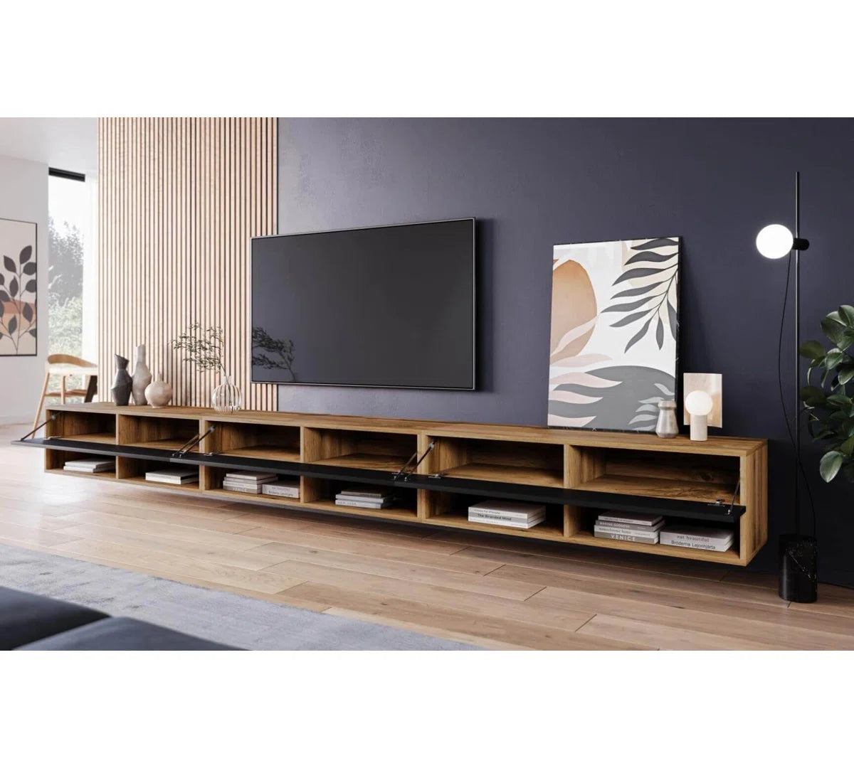 Designed for both beauty and functionality, the Sienna TV Stand features six enclosed cabinets and two open shelves, providing generous space for your media collection, electronics, and décor. Built-in cable management keeps wires hidden, while the stand’s solid structure supports TVs up to 88 inches and up to 60 kg in weight.