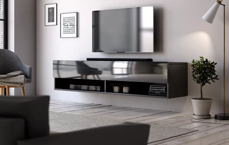 The Zenith floating TV unit is a modern, yet practical design that will add elegance to your living space. This attractive wall-mounted TV unit ensures easy access with its large spacious compartment and two shelves for storing all of those magazines or video games you love so much!