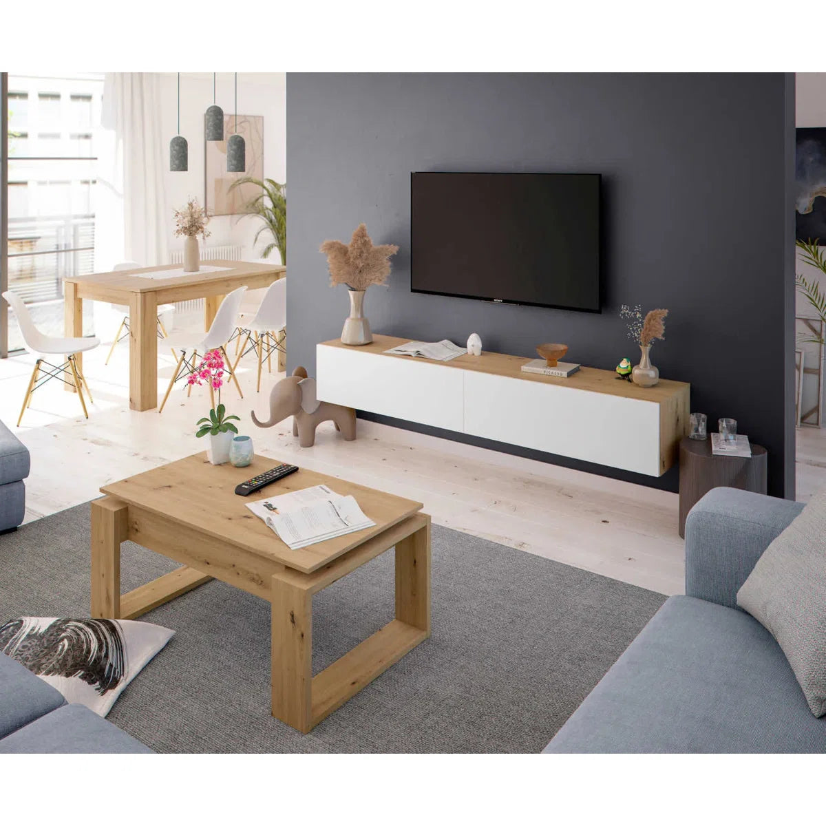 Add a fresh and refined touch to your living room with the Ava Minimalist TV Stand, a modern solution designed to blend effortlessly with Scandinavian and contemporary interiors. This wall-mounted cabinet features a clean silhouette and a sophisticated combination of Nordic Oak effect and crisp white finish, providing both functionality and visual appeal. Ideal for TVs up to 65 inches, Ava brings a sense of openness and calm to your entertainment area while eliminating floor clutter.