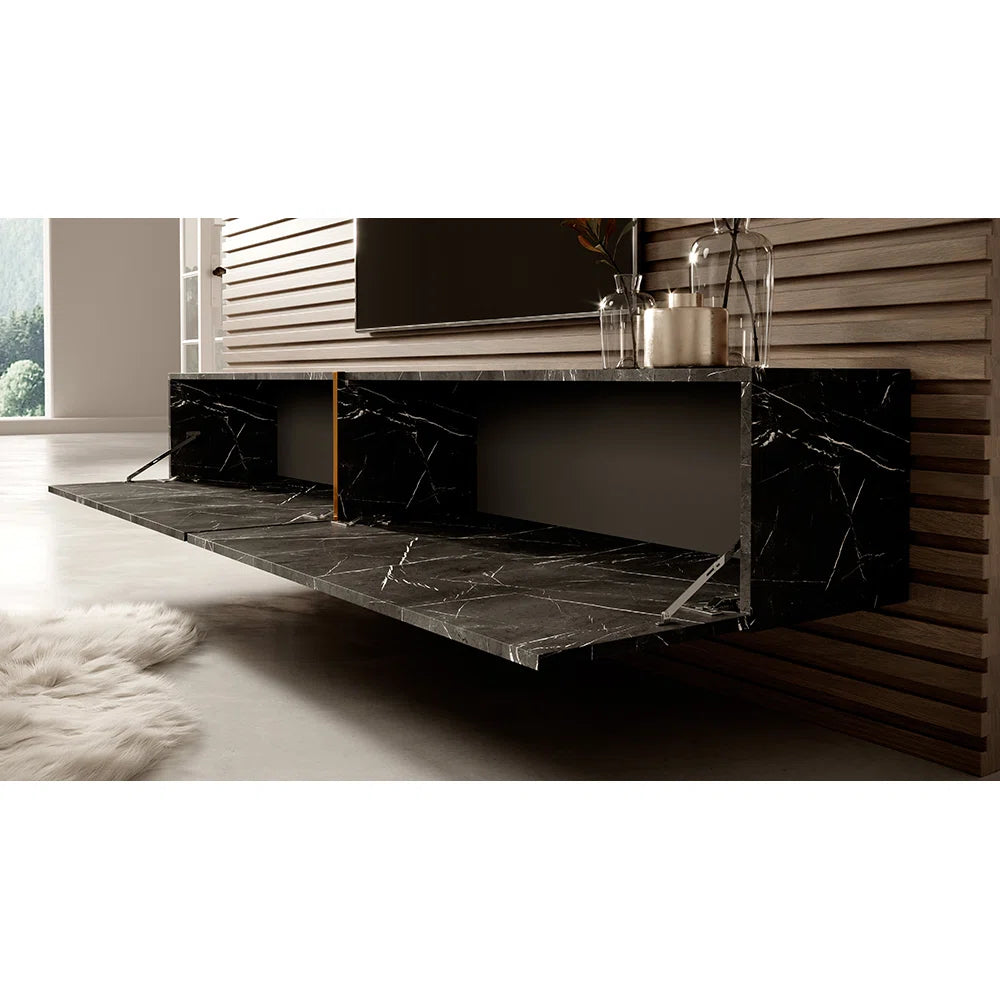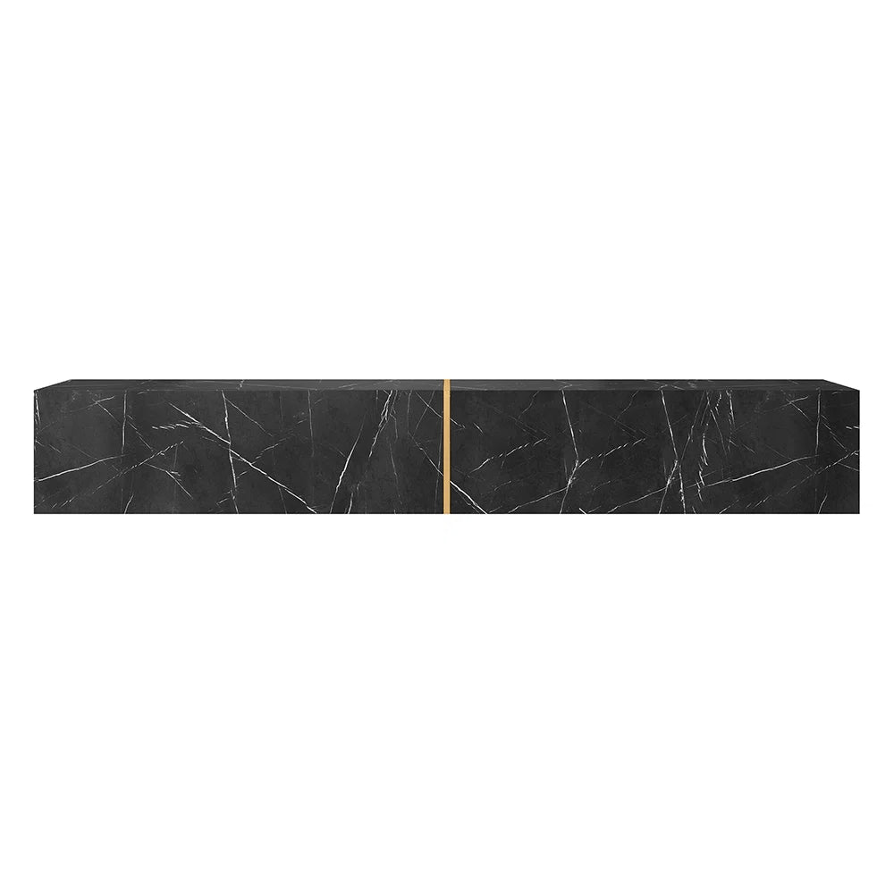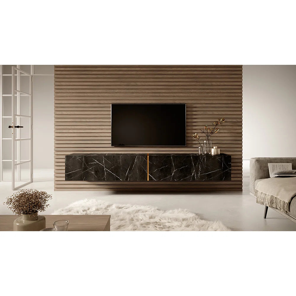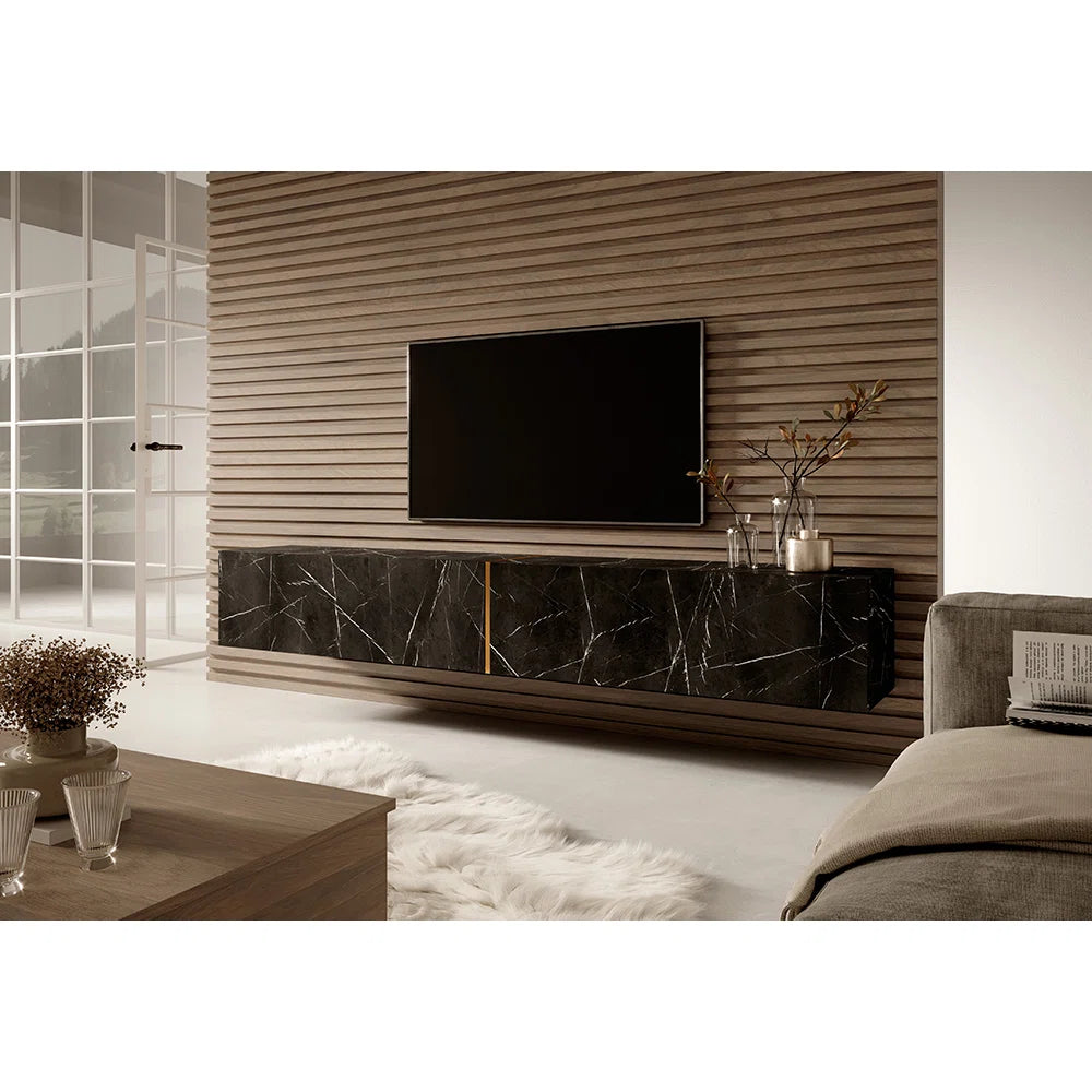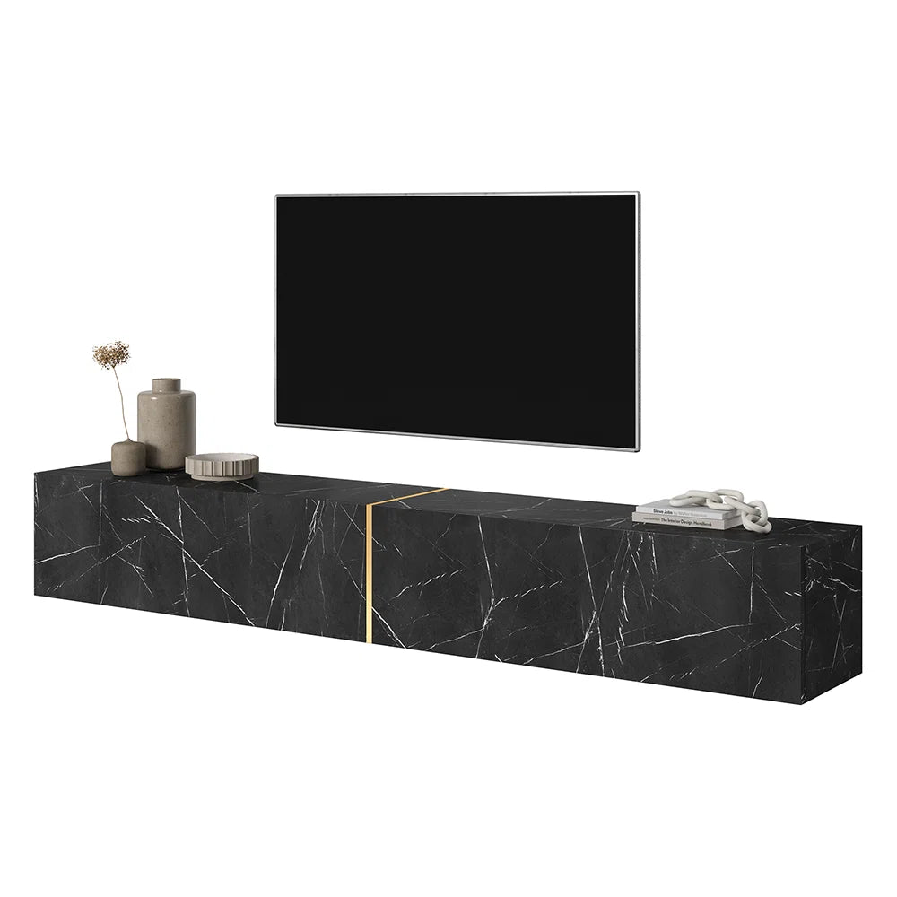 Bring bold elegance and everyday practicality into your living space with the Bramblyn TV Stand. Designed with a sleek black finish enhanced by a vertical gold marble-effect insert, this statement piece transforms any living room with minimal effort. Its clean, floating form complements both modern and classic interiors, while the subtle golden accent adds a luxurious touch that draws the eye without overwhelming the room.