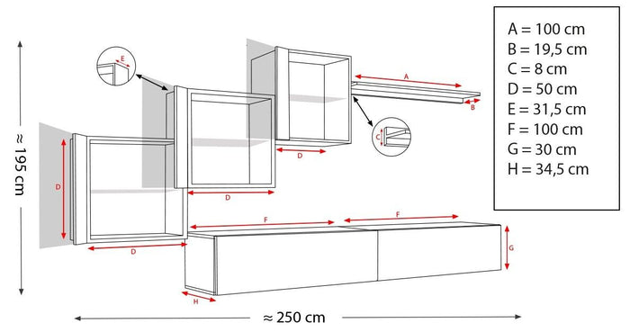 • Wall Unit: W 250 x D 34.5 x H 195 cm