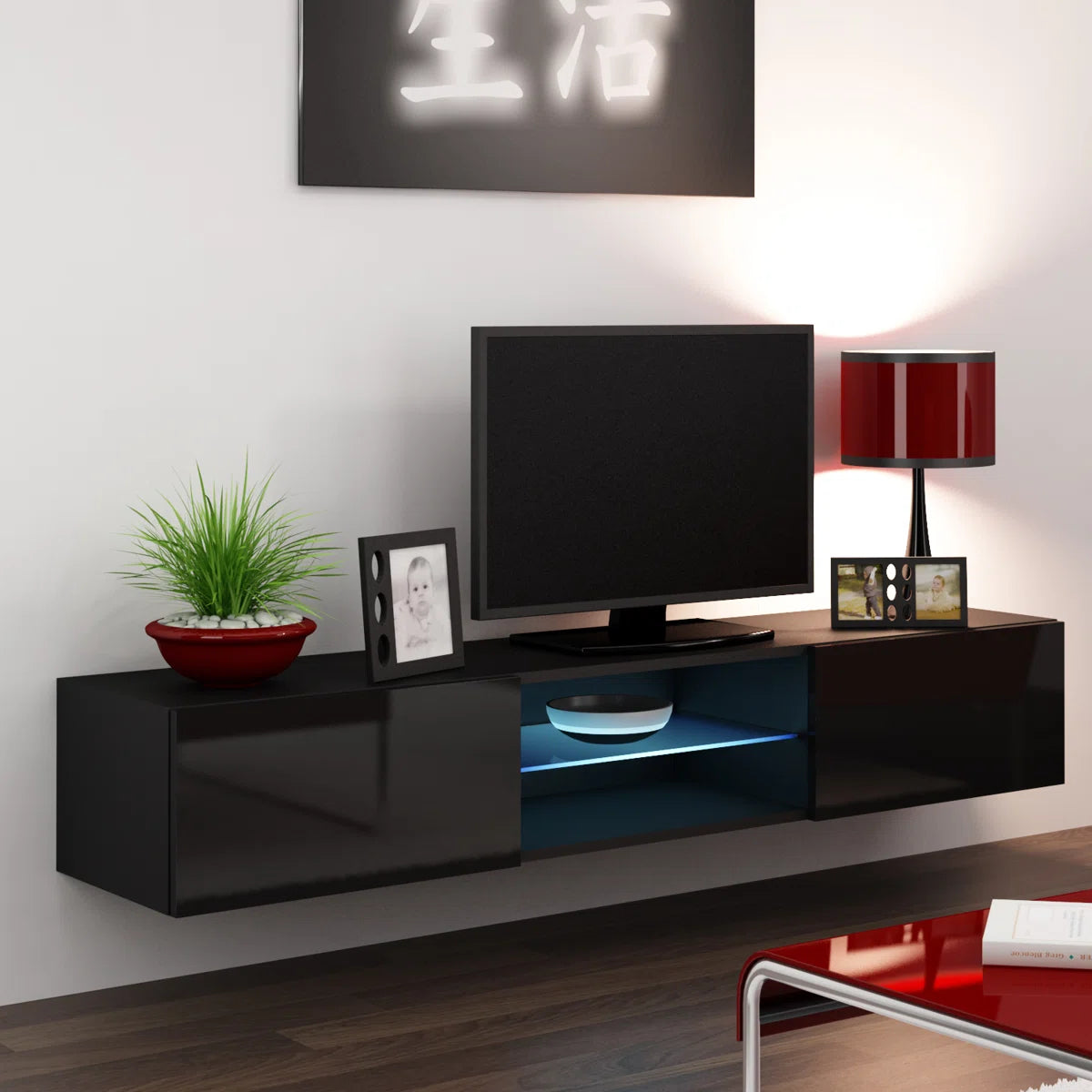 Bring a bold, modern statement to your entertainment space with the Jameson Media Shelf. Designed with a sleek black body and high-gloss front finish, this floating TV stand effortlessly enhances the aesthetics of any contemporary living room or bedroom. A central open shelf with integrated LED lighting adds a futuristic flair, perfect for displaying decorative pieces or housing your go-to electronics.