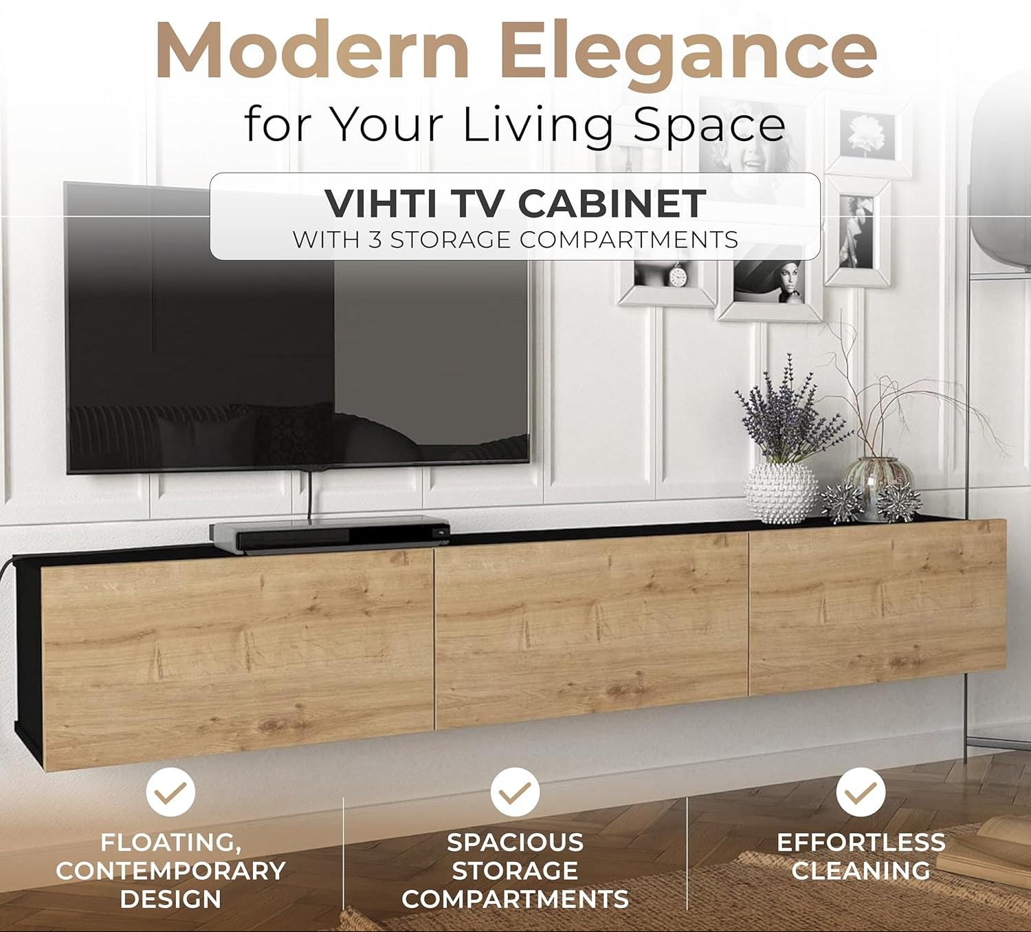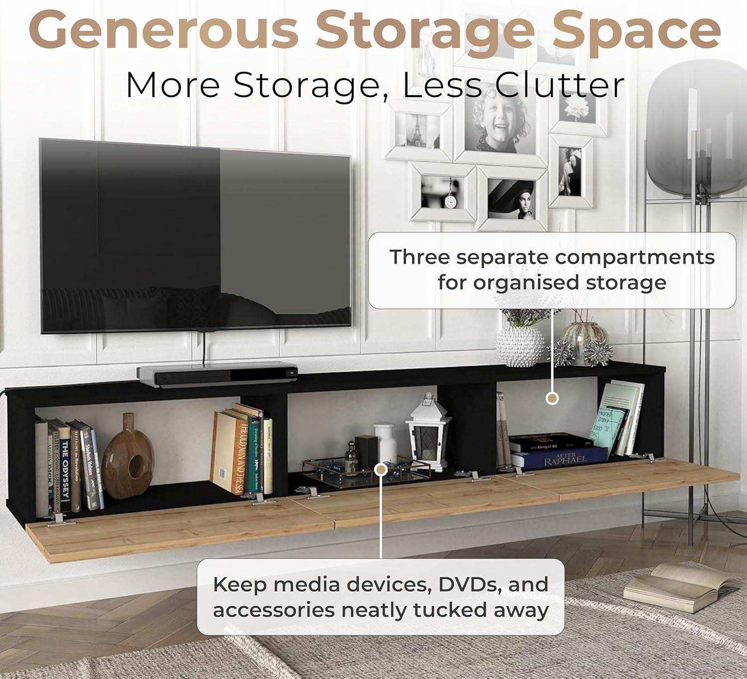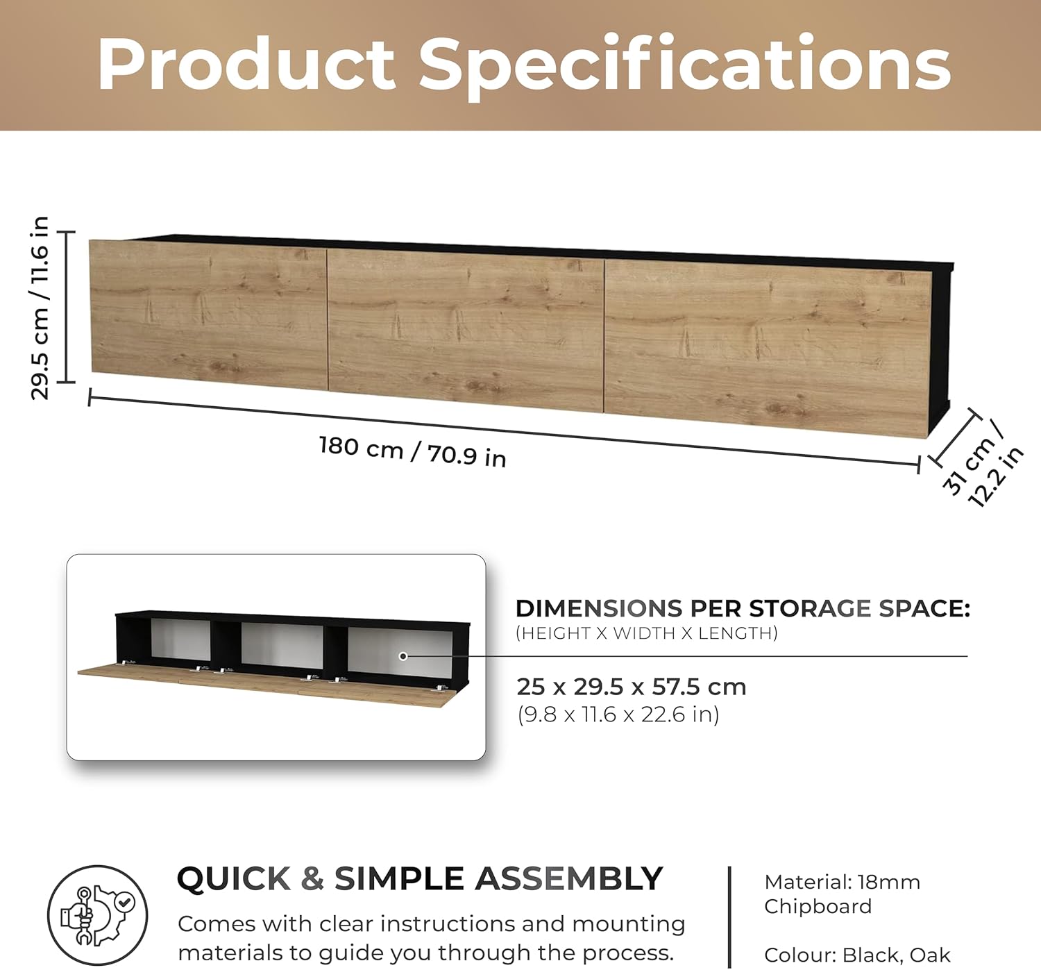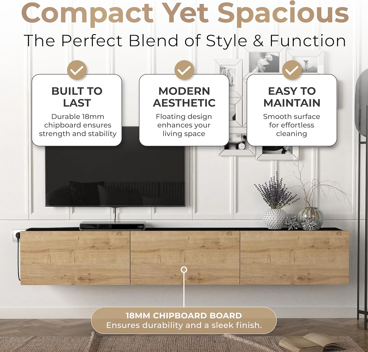 Crafted from durable 18 mm engineered wood, this TV cabinet ensures long-lasting stability and strength. It features three separate compartments with individual doors, providing generous storage for your media devices, DVDs, and accessories. Easy to assemble and maintain, the Jazz Floating TV Cabinet offers the ideal balance of elegance, durability, and everyday convenience—perfect for any modern home.
