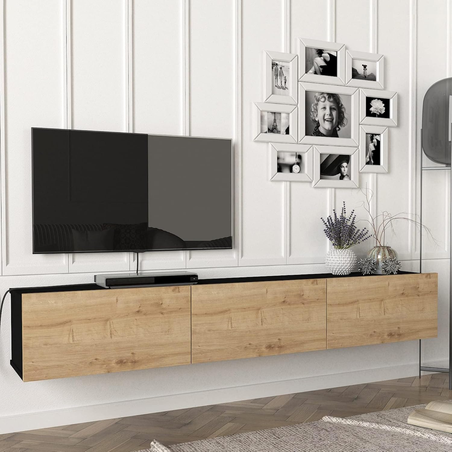 The Jazz Floating TV Cabinet in Black / Oak offers a sleek, modern solution for your entertainment setup. Designed to hold TVs up to 75 inches, this wall-mounted unit combines style, functionality, and practicality in one minimalist piece. Its floating design enhances the spaciousness of your living room, giving it a clean, contemporary look while maximizing floor space. The rich black and oak finish adds warmth and sophistication, making it a perfect match for both modern and classic interiors.