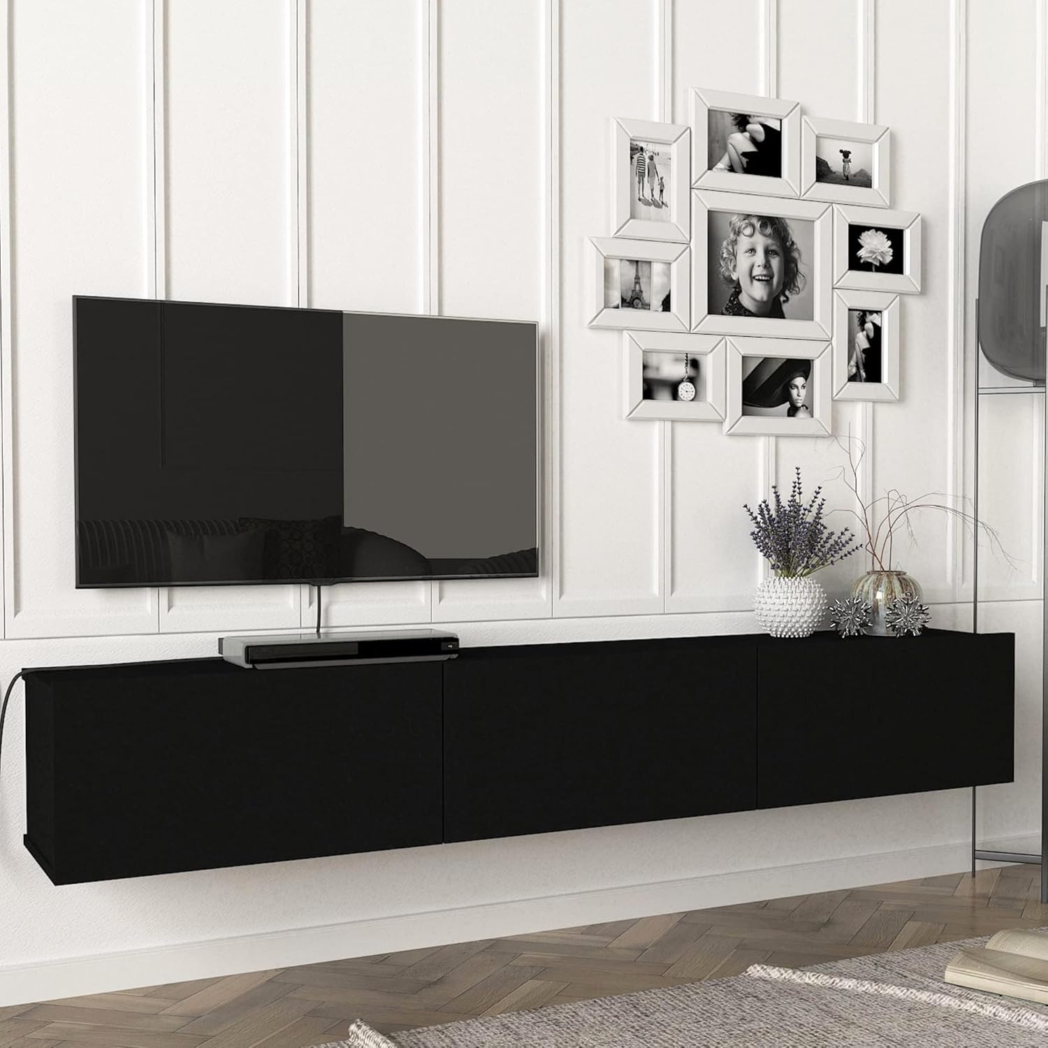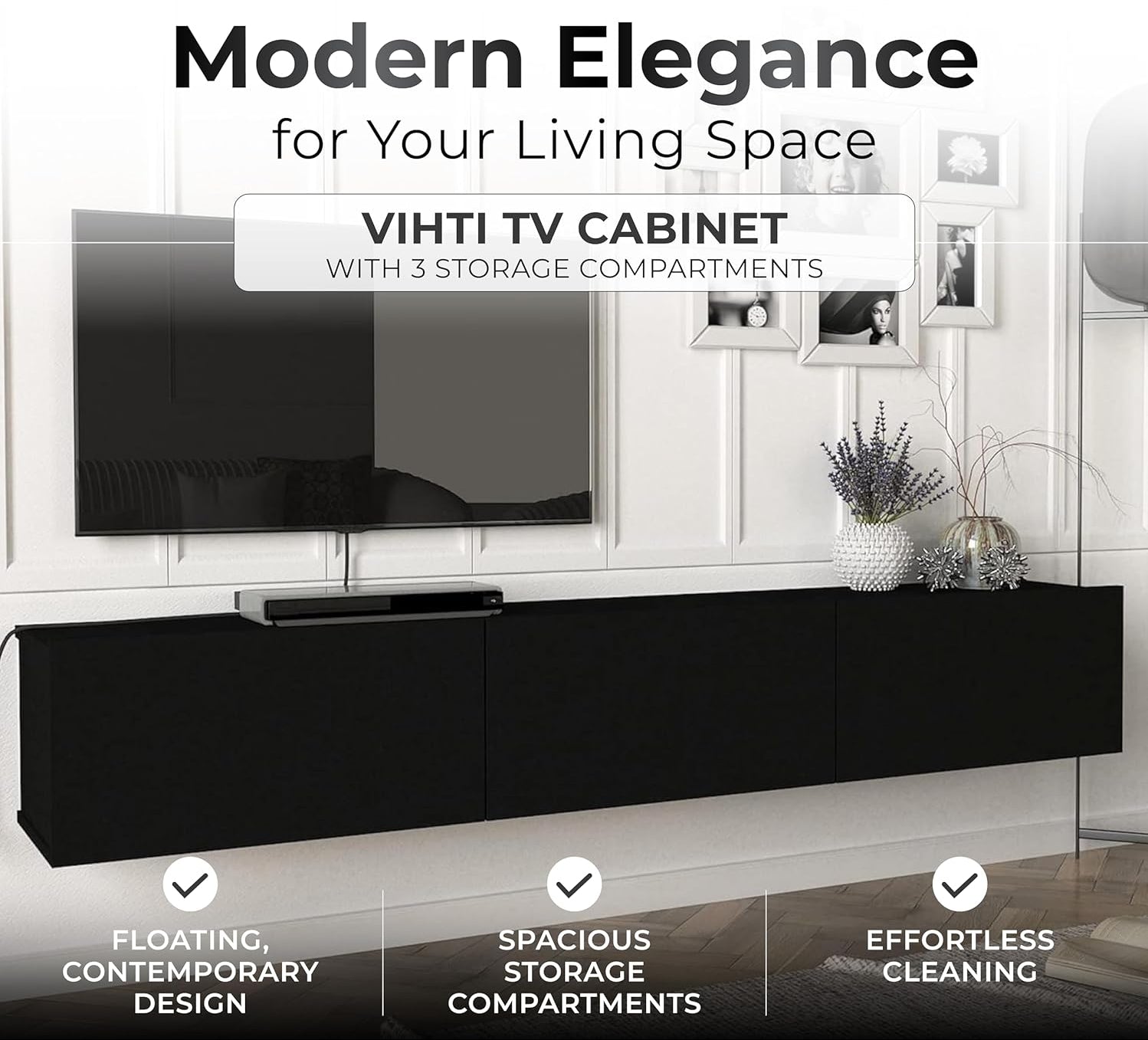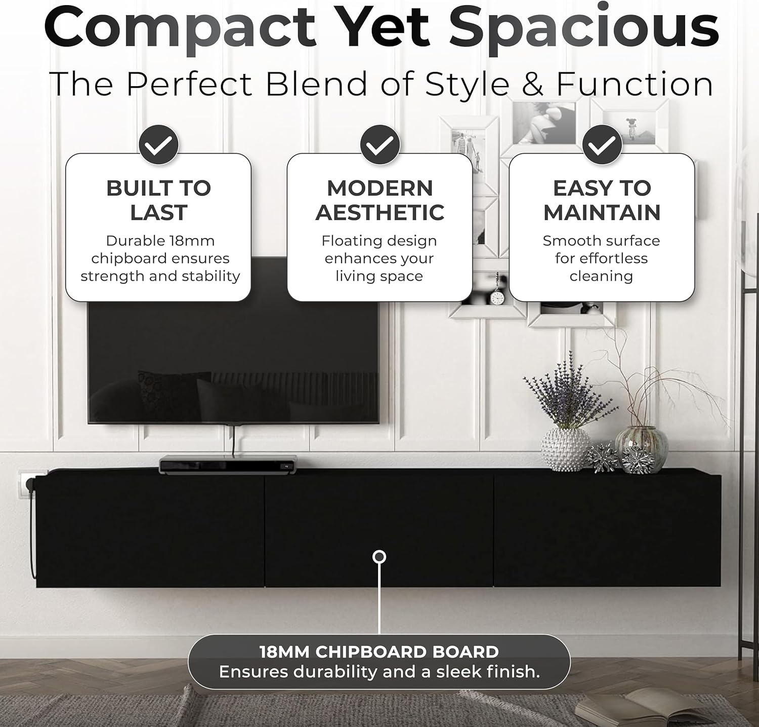 The Jazz Floating TV Cabinet in Black offers a sleek, modern solution for your entertainment setup. Designed to hold TVs up to 75 inches, this wall-mounted unit combines style, functionality, and practicality in one minimalist piece. Its floating design enhances the spaciousness of your living room, giving it a clean, contemporary look while maximizing floor space. The rich black finish adds warmth and sophistication, making it a perfect match for both modern and classic interiors.