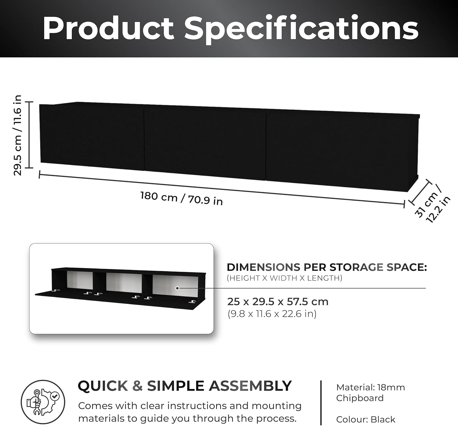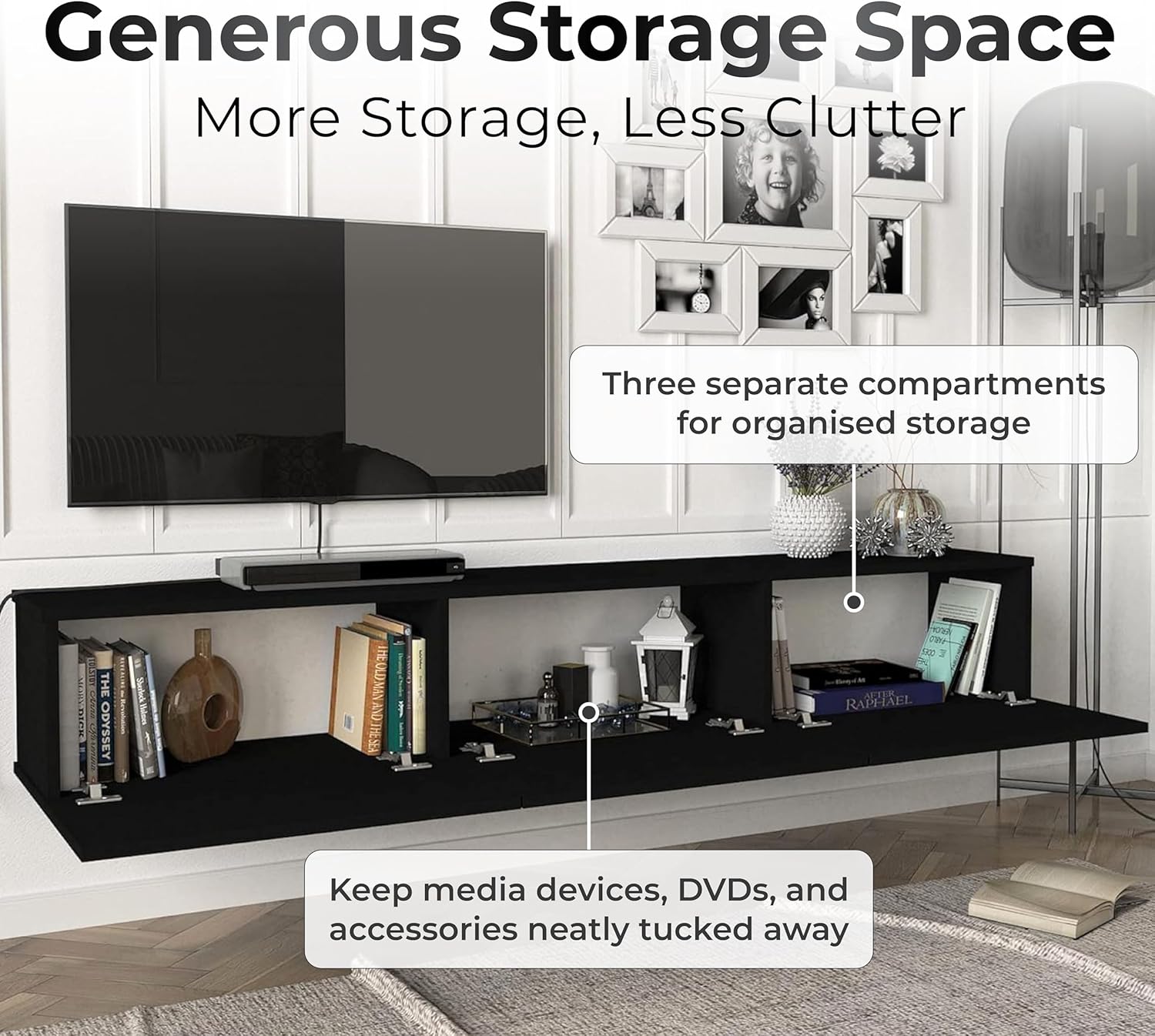 Crafted from durable 18 mm engineered wood, this TV cabinet ensures long-lasting stability and strength. It features three separate compartments with individual doors, providing generous storage for your media devices, DVDs, and accessories. Easy to assemble and maintain, the Jazz Floating TV Cabinet offers the ideal balance of elegance, durability, and everyday convenience—perfect for any modern home.