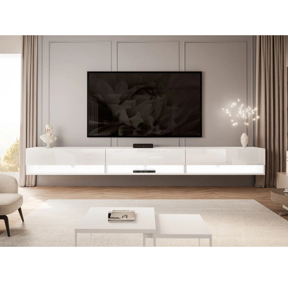 Elevate your entertainment area with the Kira LED Wall TV Console, a perfect blend of contemporary design and smart functionality. Part of the sleek Calante collection, this wall-mounted console is ideal for those who appreciate minimalist aesthetics that seamlessly suit a wide range of interiors. Designed for TVs up to 70 inches (with a maximum screen size of 88"), it offers both elegance and practical storage wrapped in a modern, handle-less silhouette.