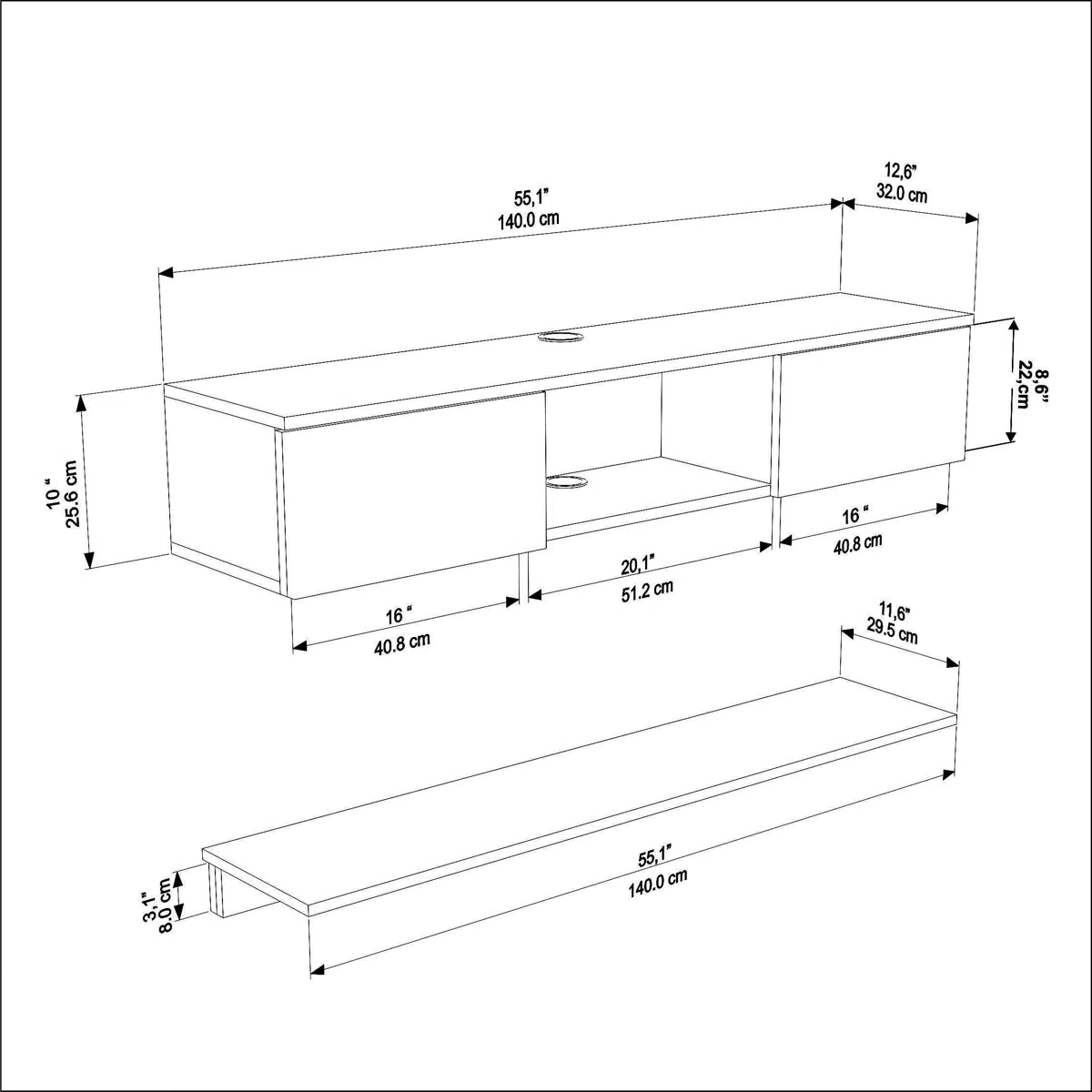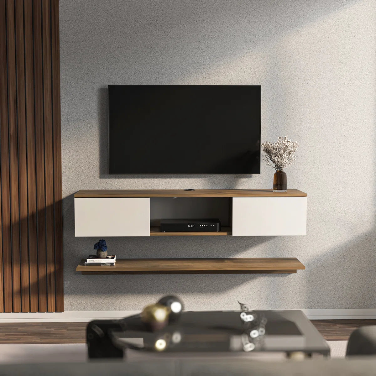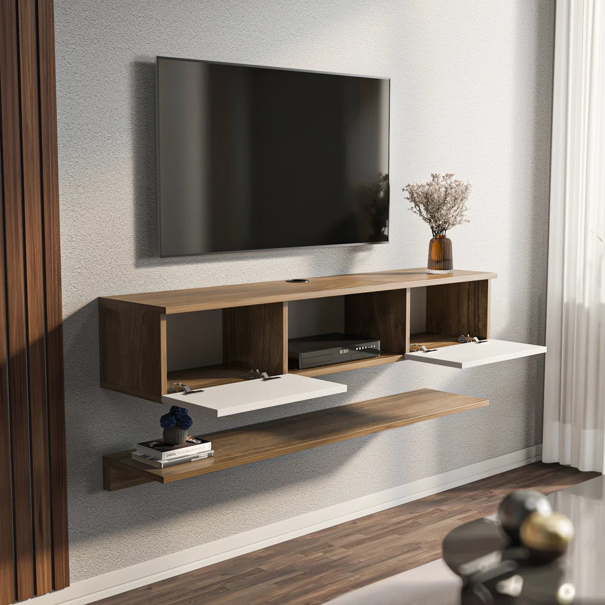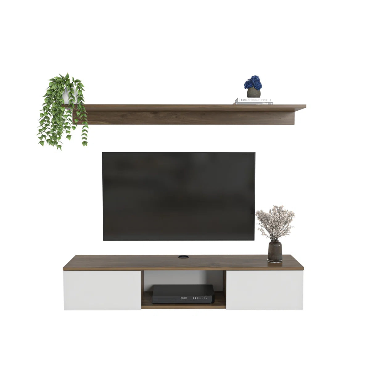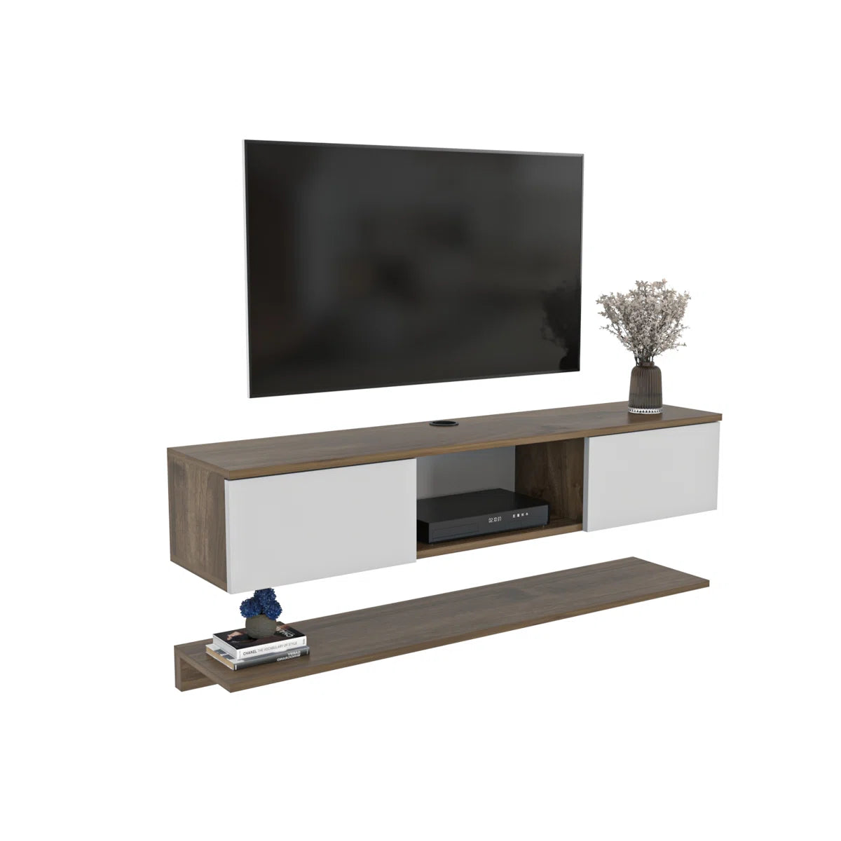 Add a sleek, space-saving focal point to your living space with the Reyazel Modern Floating TV Stand. Designed in a warm walnut and crisp white finish, this unit blends modern aesthetics with smart functionality. Ideal for compact rooms, its floating mount keeps the floor area open while providing all the storage you need for a clutter-free entertainment setup.